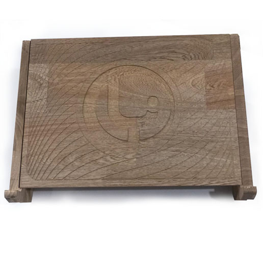 Soporte para Laptop, portátil de 14 y 15 " fijo, fabricado en madera roble alistonado, en la superficie tiene un grabado, las ranuras permiten la refrigeración y circulación de aire para evitar el recalentamiento del computador.